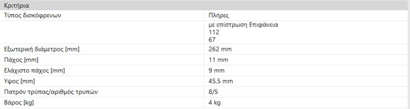 ΔΙΣΚΟΠΛΑΚΕΣ ΕΜΠΡΟΣ 190E W201 ΑΠΛΗ 262X11mmΠαραλήπτης :